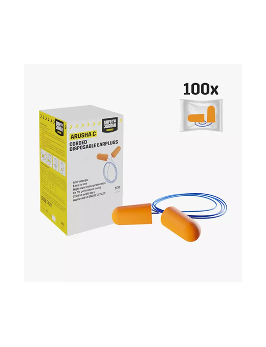 Disposable and slow-recovery foam earplugs that provide comfortable hearing protection. The Arusha plugs protect against loud or permanent noises by reducing the volume to safe levels, even in heavy-duty noise environments. Simply roll the plug into a small cylinder, insert it into the ear and wait for it to expand comfortably in the ear canal. These earplugs are permanently connected by a plastic cord, so they can be worn around the neck when not in use.