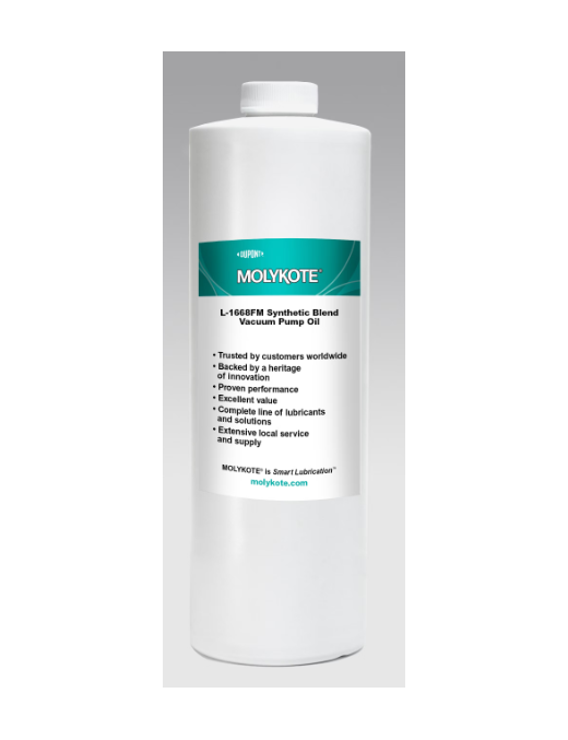 Oil-lubricated rotary vane vacuum pumps used in various industries, from food packaging and medical sterilization to chemical manufacturing and battery plant operation. MOLYKOTE® L-1668FM Synthetic Blend Vacuum Pump Oil is designed to extend maintenance and oil drain intervals in particularly demanding or harsh operating environments and to provide proper viscosity and film thickness protection at normal operating temperature.