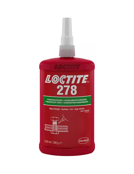 LOCTITE® 278 is a green, high strength, medium-viscosity threadlocker with a fixture time on steel and brass of 20 minutes, and on stainless steel of 60 minutes. Withstands high temperatures up to 200°C (392°F), and has proven capable of providing breakaway torque on M10 bolts of 42 Nm.