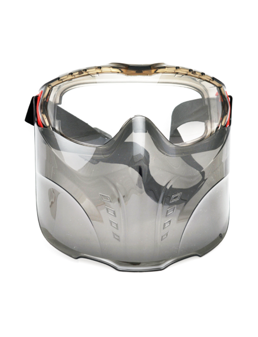 Fits over prescription eyewear and contoured body for improved facial fit and vision